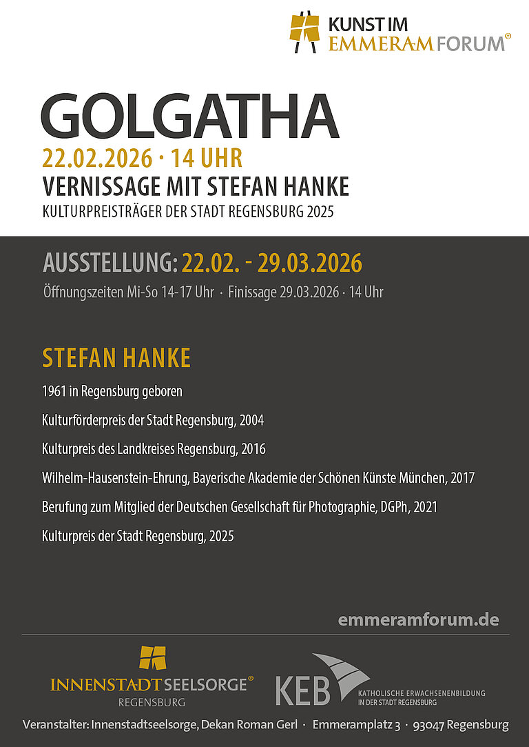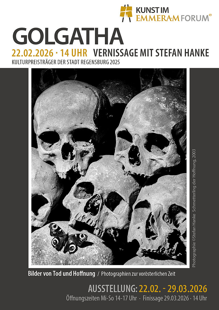 Wir freuen uns, am ersten Fastensonntag die erste Kunstausstellung im EmmeramForum zu eröffnen. Unter demTitel Golgatha - Bilder von Tod und Hoffnung , Photographien zur vorösterlichen Zeit - präsentiert Stefan Hanke, Kulturpreisträger der Stadt Regensburg 2025, seine Werke.