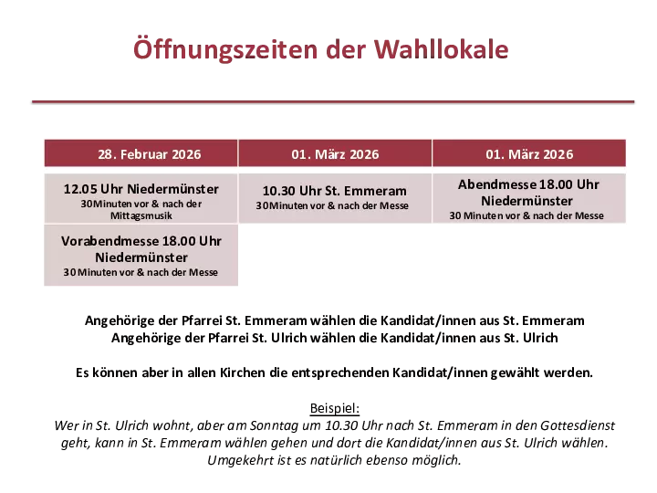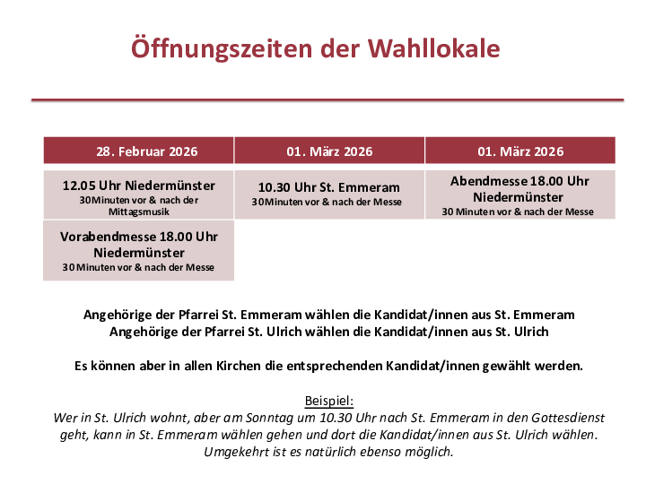 (Sa, 18 Uhr Niedermünster / So, 10.30 Uhr St. Emmeram / So, 18 Uhr Niedermünster) sowie vor und nach der Mittagsmusik in Niedermünster (Sa, 12.05 Uhr) in einem schriftlichen Wahlgang die Zusammensetzung des künftigen Beratungsgremiums für die Dompfarreiengemeinschaft mitzubestimmen.