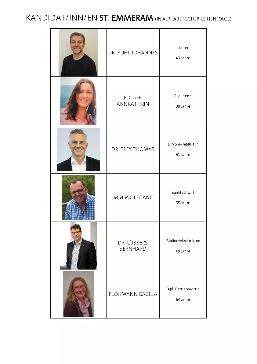 Es wird – den diözesanen Richtlinien gemäß - wieder ein gemeinsamer Pfarrgemeinderat gebildet. Je zehn Kandidierende werden für St. Emmeram, je zehn für St. Ulrich gewählt. Jeder Pfarreiteil wählt für sich. Wie in den letzten Jahren ist es den Pfarrangehörigen von St. Kassian möglich in St. Ulrich mit zu wählen.
